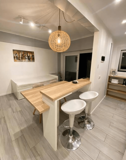 En su interior, encontrarás una cocina completamente equipada con nevera, horno y todo lo necesario para preparar tus propias comidas. La sala de estar cuenta con un cómodo sofá cama y una TV de pantalla plana para entretenimiento.